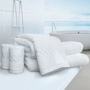 Quality and longevity are at the heart of the16"x29" & 16"x30" White Hand Towels from the Oxford Viceroy Towel Collection. Crafted with100% premium ringspun cottonand featuring a  jacquard checkered border design, these hand towels offer an ideal blend of elegance, absorbency, and lasting durability. The use of2-ply yarns enhances the strength of the towel, ensuring it retains its premium quality even after repeated washings.